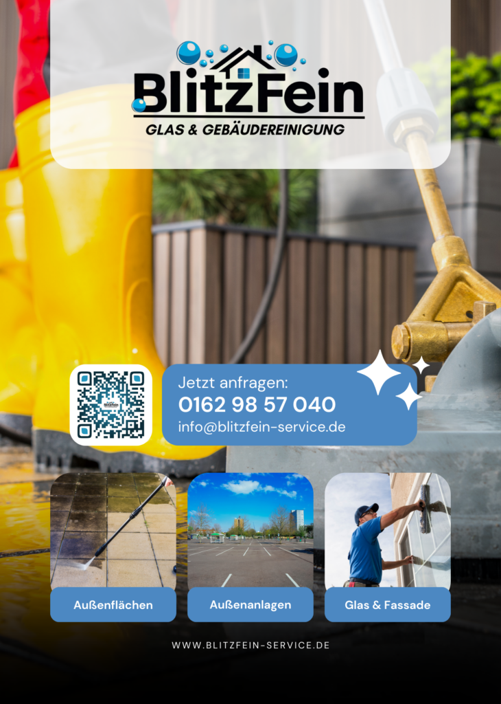 Bei BlitzFein Glas- & Gebäudereinigung legen wir großen Wert auf eine gründliche Außenreinigung, damit Ihre Immobilie ordentlich und gepflegt wirkt. Unser Team bringt langjährige Erfahrung in der Reinigung von Außenanlagen, Hofbereichen, Solaranlagen, Dachziegeln, Fassaden und Fenstern mit. Wir arbeiten flexibel und nutzen moderne Technik sowie umweltfreundliche Reinigungsmittel, um beste Ergebnisse zu erzielen – unabhängig von Größe oder Art der Fläche.